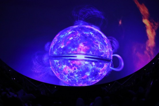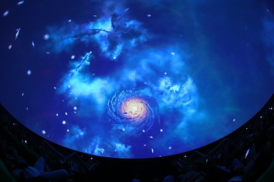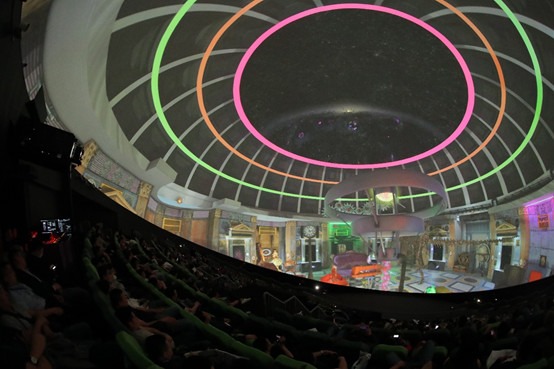 目前,國內第一大直徑30米球幕的廣闊畫面拓展了觀眾視野,觀看視角高達165°,觀眾仿佛置身于畫面之中,更容易產生身臨其境般的視覺效果。10臺NEC PH3501QL+旗艦工程投影機在銀幕上投射出了8800萬個像素點,真8K分辨率的極致效果得到業界人士的一致好評。