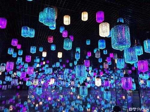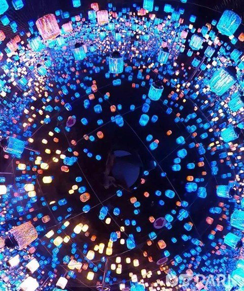 在『夢幻迷鏡』里,幾千盞燈散發著色彩各異的光,明亮而溫馨地照耀穿梭其中的每一張面孔。在這里,數字空間和實體空間相融合,房間的地面和墻面都像鏡子一樣能夠反射光線,投影著燈盞的形態和顏色,營造了如夢如幻的沉浸式體驗。