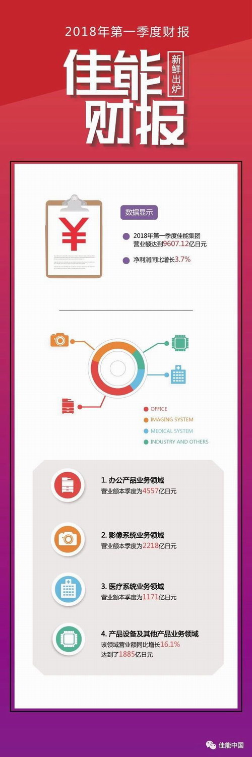 2018年4月25日,佳能集團發布了2018年第一季度財報。財報顯示,2018年第一季度佳能集團營業額達到9607.12億日元,凈利潤同比增長3.7%。預計2018年全年仍會持續營業額、利潤雙增長的態勢。