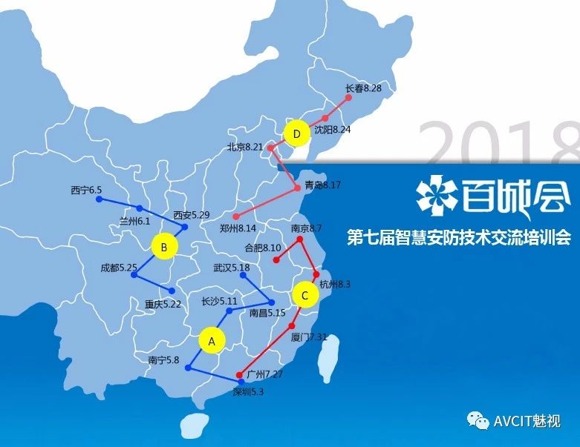 本屆“百城會(huì)”將在全國20個(gè)城市舉行,分東(C)、南(A)、西(B)、北(D)四條線路。