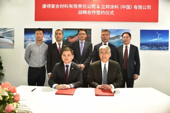 4月27日上午, 康得復材與立邦涂料舉行戰略合作簽約儀式,康得復合材料公司副總裁、CTO何鵬博士(前排左),立邦涂料母公司新加坡立時集團CTO洪江博士(前排右),代表雙方企業出席簽約儀式。