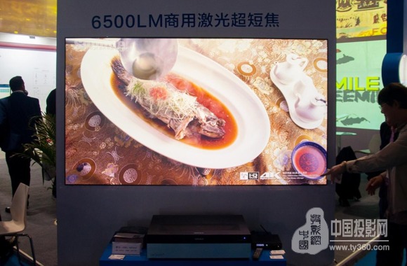 在視美樂展廳左側顯示墻上,細膩的美食呈現畫面吸引了眾多目光,這款新推出的6500LM商用激光超短焦集高亮度、高清晰度、高動態對比度“三高”于一體,配100寸抗光幕,即使在展館復雜光照的環境里,依然能夠完全展示其畫面表現力,色彩準確、明艷;畫面通透、光線感強烈;聚焦清晰、細節豐富。