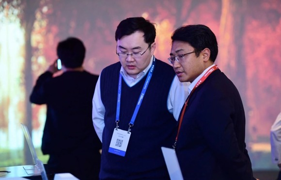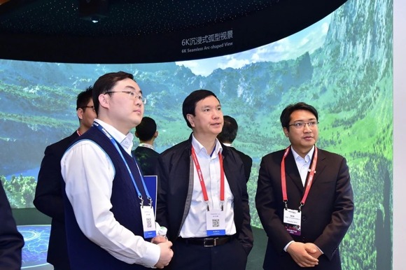 上電黨委書記、董事長、中航國畫董事長蒲毅向萬科集團高級副總裁丁長峰介紹國畫激光投影