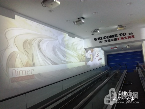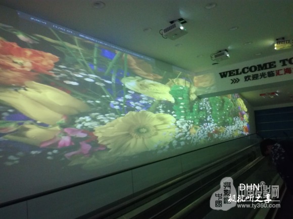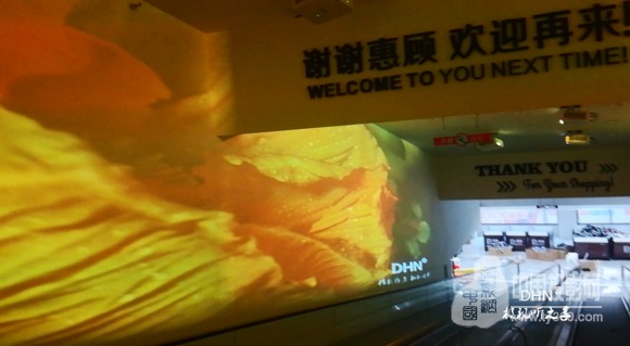 為支持每天長達7小時以上的營業時間,不同時間段展示不同主題,采用10臺DHN-DM350X短焦投影機,分別搭配2臺迪碩(DISO)- DK517、 DW705-3純硬件邊緣融合器,在電梯兩邊墻面分別投16:3投影畫面,并放映同期主題片源,搭配其他附件,整體實現左右墻面聯動。當顧客入超市前,駐足的同時即可視界享受。