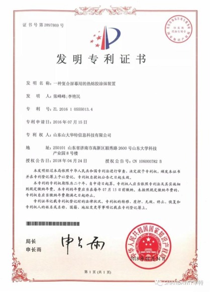 經(jīng)國家知識產(chǎn)權(quán)局審查,我公司申請的“一種復(fù)合屏幕用的熱熔膠涂抹裝置”于2018年4月24日被授予發(fā)明專利權(quán),專利號:ZL201610555013.4,專利權(quán)自授權(quán)公告日起生效,有效期二十年。
