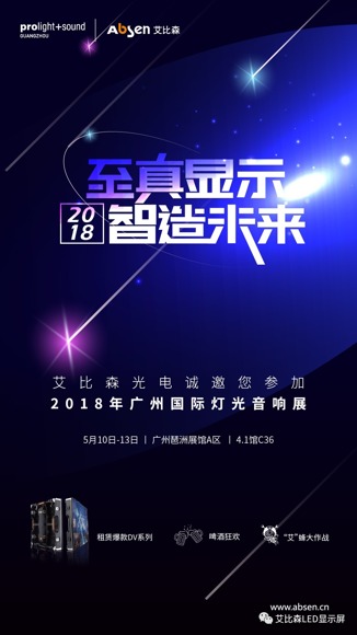 5月10至13日,2018 ProLight+Sound 廣州國際專業燈光音響展覽會將在廣州進出口商品交易會展館(琶洲會展)A區盛大舉行!本次展會主辦方將作出全新嘗試,除了一系列的專業燈光、音響、舞臺設備等產品外,展會將重點展出演繹設備、通信與會議及KTV領域上前沿的總體解決方案。屆時,艾比森也將攜爆款DV系列、通透輕薄透明屏、軟屏等產品在4.1號館C36展位精彩亮相。