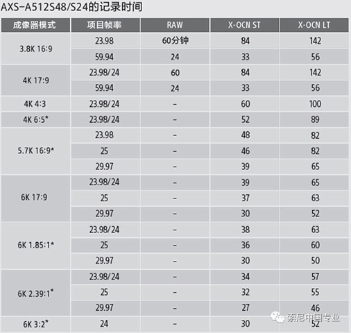 X-OCN格式在CineAltaV攝影機(jī)上的記錄時間