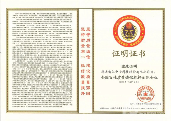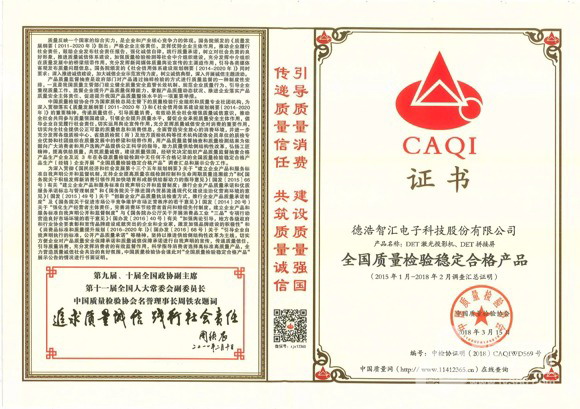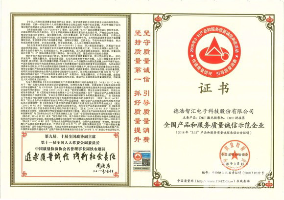 近期,DET德浩在中國質(zhì)量檢驗(yàn)協(xié)會(huì)舉辦的“2018年“3.15”國際消費(fèi)者權(quán)益日“產(chǎn)品和服務(wù)質(zhì)量誠信承諾”活動(dòng)中,榮獲“全國百佳質(zhì)量誠信標(biāo)桿示范企業(yè)、全國產(chǎn)品和服務(wù)質(zhì)量誠信示范企業(yè)、全國質(zhì)量檢驗(yàn)穩(wěn)定合格產(chǎn)品”榮譽(yù)證書。