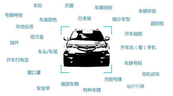 具體識別內容包括車輛信息:車標、細分車型、車輛顏色、類型、特種車輛等;車牌信息:車牌號碼、顏色、號牌種類、臨時號牌、污損號牌等;駕駛違法行為:不系安全帶、開車打電話等;特征信息:天窗、掛件、紙巾盒、行李架、年檢標簽、遮陽板分析等;駕駛員行為分析:戴口罩、抽煙、玩手機等。
