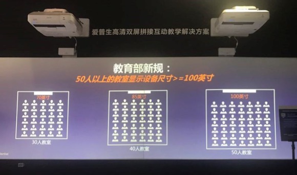 除超短焦懸停互動教學(xué)方案外,此次展會愛普生還推出了雙屏拼接互動教學(xué)解決方案。該方案由兩個大屏幕拼接而成,兩臺Epson CB-710Ui激光教育超短焦互動投影機(jī)實現(xiàn)投影無縫對接,拼接成一整個超寬屏畫面,打造出大屏幕教學(xué)環(huán)境。