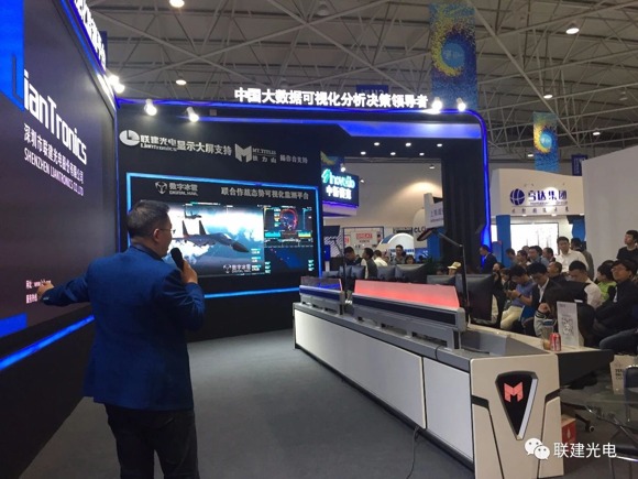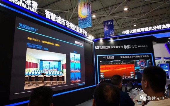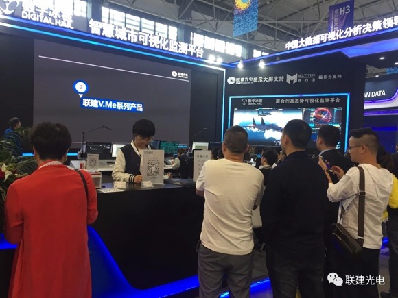 作為LED大屏可視化領域的領頭羊,聯建光電在現場搭建了一個可視化大數據管理平臺,通過表達、建模以及對立體、表面、屬性以及動畫的顯示,對數據加以可視化解釋。并現場演繹了智慧城市、工業監控、網絡安全、商業監控、航天戰場等領域的大數據可視化應用,體驗感十足。