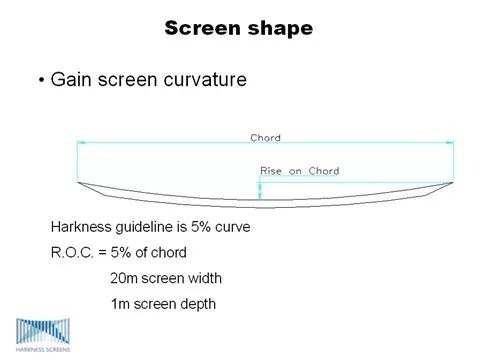 這個弧度通常用弦高來定義,即銀幕側邊距中心平面的距離。你可以用弦高除以銀幕寬度,從而得到相對的弧度,用%表示。下圖(由Harkness銀幕提供)解釋了如何計算這個參數。在這里使用‘rise on chord’來表示弦高。