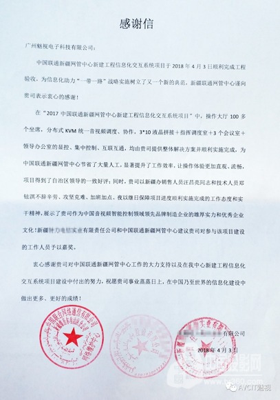 2018年4月,應用了AVCiT魅視分布式綜合管理平臺解決方案的中國聯通新疆網管中心信息化交互系統建設項目圓滿完成了全部的工程驗收。