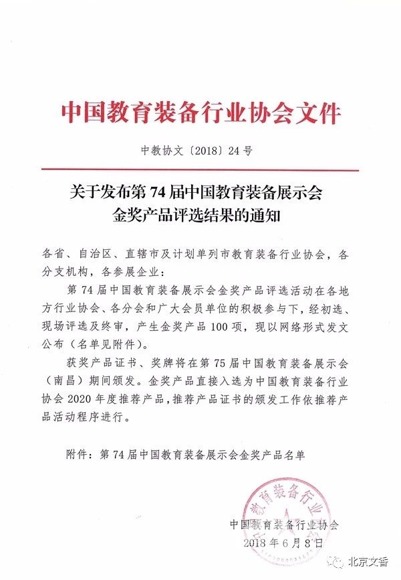 6月8日,中國教育裝備行業協會發布了《關于發布第74屆中國教育裝備展示會金獎產品評選結果的通知》,經中國教育裝備行業專家評委網上初評、現場評選及終審,北京文香榮獲第74屆中國教育裝備展示會金獎,同時入選為中國教育裝備行業協會2020年度推薦產品。