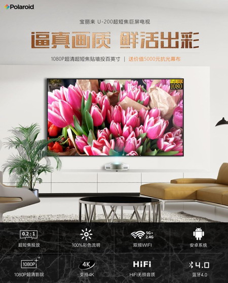這款U-200不僅白光亮度高,LED光源色域也更寬,成像色彩亮度更高,顏色更鮮艷,100%的色彩流明輸出使還原色彩更真實。搭配寶麗來U-200專用的100英寸進口抗光幕布,對色彩和亮度產生正增益,提升視覺亮度和色彩飽和度,能更有效的帶給用戶更加震撼的巨屏家庭影院體驗。
