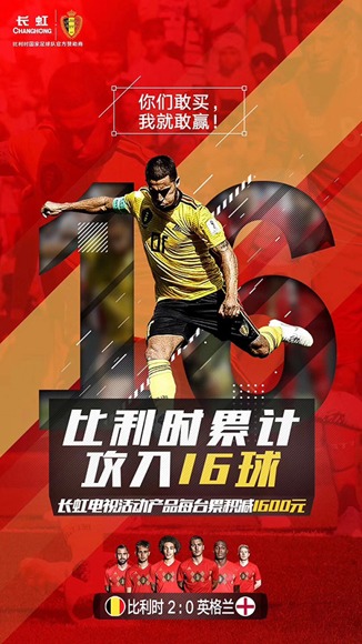 賽事營銷中,企業選擇合作球隊如同押寶,球隊成績好是運氣,如果成績不好,總有難言的遺憾?砷L虹與比利時隊的聯姻,從一開始就拿到了宣傳優勢。何況比利時隊在本屆世界杯中取得7戰6勝的佳績,接連打敗巴西、英格蘭等老牌勁旅,小組賽積分高居小組第一,伴隨著比利時隊一路過關斬將,長虹的借勢海報和相關話題連續數日在社交媒體刷屏,再次提升了品牌傳播效果。