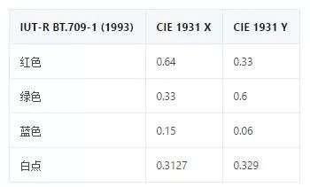 隨著廣播電視相關技術的發展,數字電視技術逐漸取代了傳統的模擬電視技術,高清晰度電視(HDTV)也開始嶄露頭角。1989年ITU(國際電信聯盟——聯合國下屬組織,當時名為CCIR,即國際無線電咨詢委員會)將Pointer色域定為HDTV的目標色域。在1993年,ITU正式通過了標題為“Basic parameter values for the HDTV standard for the studio and for international programme exchange ”,編號為ITU-R BT.709-1的建議。編號中的R代表Radiocommunication(無線電通訊),B代表Broadcasting(廣播),T代表Television(電視)。從名字就可以看出該建議是針對HDTV提出的。在該建議中,規定了三原色色坐標如下: