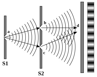 楊氏雙縫干涉實(shí)驗(yàn)是一個(gè)著名的光學(xué)實(shí)驗(yàn),托馬斯•楊把一支蠟燭放在一張開了一個(gè)小孔的紙前面,這樣就形成了一個(gè)點(diǎn)光源,然后在紙后面再放一張開了兩道平行狹縫的紙,從小孔中射出的光穿過(guò)兩道狹縫投到屏幕上,就會(huì)形成一系列明暗交替的條紋。楊氏雙縫干涉實(shí)驗(yàn)獲得相干光的方法叫做分波陣面法,其原理示意圖如圖3所示,通過(guò)在雙縫b、c之前加一個(gè)小孔a,根據(jù)惠更斯原理,經(jīng)小孔a衍射的光為一個(gè)球面波,其波陣面上任一部分都可看作是具有相同頻率、相同相位的新光源,因此在雙縫b和c處衍射的光波為相干光,進(jìn)而在屏幕處形成明暗交替的干涉條紋。