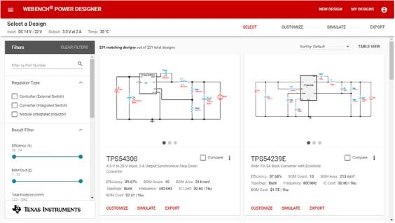 WEBENCH電源設計器之前版本中的自定義、模擬和導出設計,已經從一個單一界面分成了三個新界面,并將通過邏輯步驟指導您完成電源設計流程。