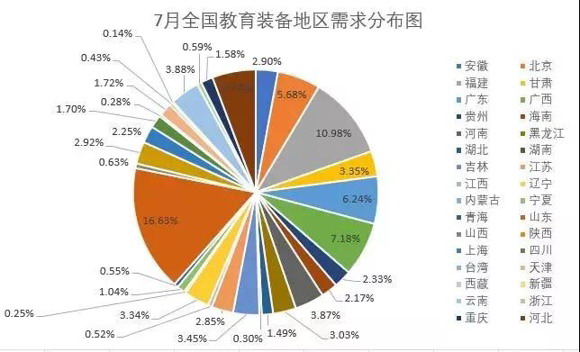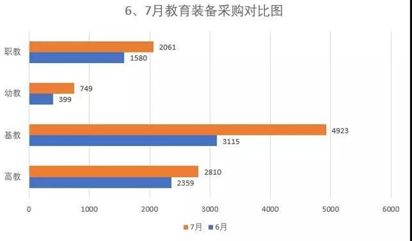 根據教育裝備采購網在全國范圍內的數據監測,7月采購需求承接前半年走勢,比6月有小幅度增長,基教仍占有需求最大量。