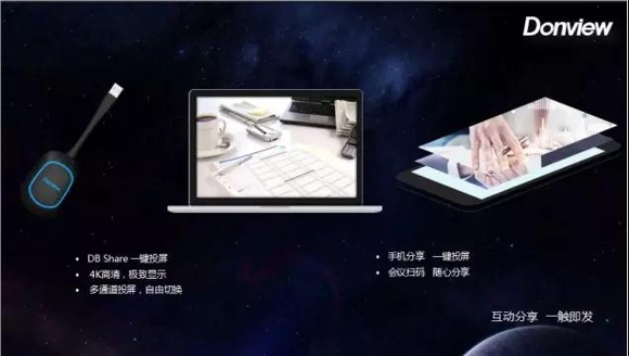 Donview智能會議平板掙脫了會議室頻繁切換連接帶來的束縛。無線傳屏器DB Share ,可實現一鍵投屏功能,不僅可以擺脫會議室中雜亂接線的束縛,還可以通過一鍵投屏同步到大屏,同時支持通過會議平板反向控制,流暢快捷,將自己的新鮮創意輕松分享給參會者,匯聚不同的思想融合,擦出創意的火花,點燃會議激情。
