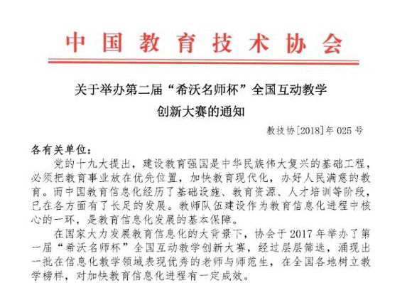 因此,為了更好地幫助教師隊伍的建設,聚集更多信息化教學教師楷模,發揮標桿作用,搭建更豐富多樣的教育資源展示與共享的平臺,同時為更好地貫徹《教育信息化“十三五”規劃》精神,從師范生的培養開始,加強信息化教學理念的深入,結合信息化企業提供的信息化教學應用技術,全面提高師范生的綜合素質,中國教育技術協會已在2018年4月17日在全國范圍內開展第二屆“希沃名師杯”全國互動教學創新大賽。