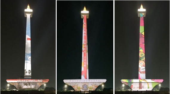 雅加達市中心的國家紀念碑隨著鮮明的投影而充滿生機,大力推廣了印度尼西亞首都的形象,歡迎前來參加亞運會的健兒們。