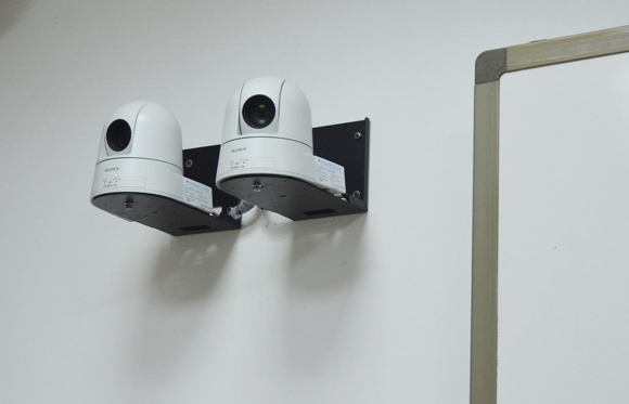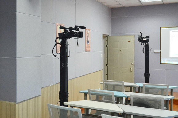 另一個教室是全自動錄播系統教室,配備了索尼LRS-1全自動錄播系統,教室前、后分別安裝了兩組共4臺云臺攝像機,拍攝角度全面覆蓋,老師可以隨時輕松切換視角與遠景/近景。