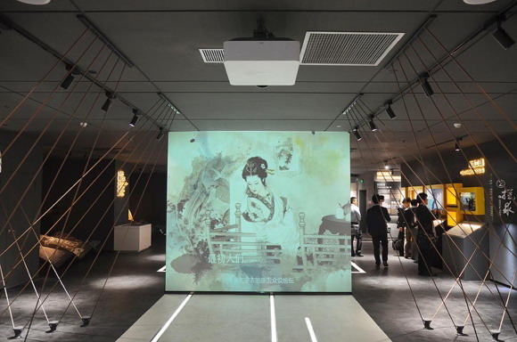 步入大浪時尚小鎮展廳,第一個展項頗具藝術氣質,兩側絲線集束,居中1臺VPL-F430HZ呈現服飾起源,畫面包括史料照片與工筆國畫,講述服飾“御寒、遮羞、護體、審美”發展歷程。