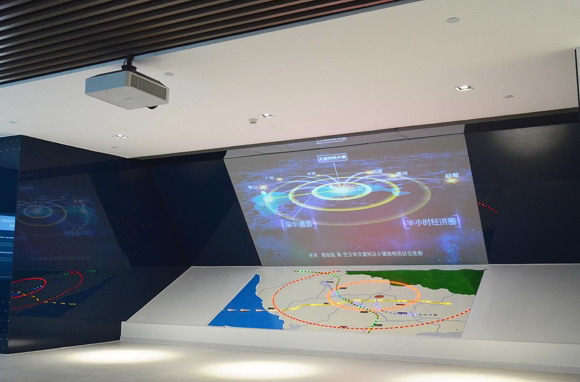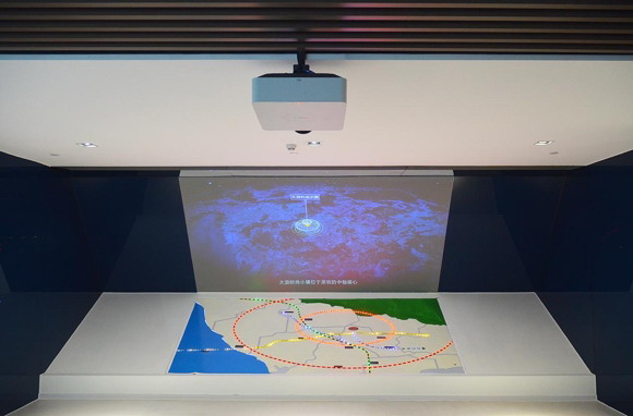 穿過紗幕走廊,我們來到了氣勢更滂沱的大浪時尚小鎮規劃展區,首先映入眼簾的方案是1臺VPL-F430HZ創造的異形方案,投影畫面與燈帶地圖形成一個向內折角,仿佛一張巨型卡片徐徐打開;展現了小鎮卓越的地理位置——地處深圳中軸核心,商業影響力遍及廣州、東莞、汕尾等重要城市;燈帶地圖描繪了陸、海、空立體交通網為小鎮帶來的區位優勢。
