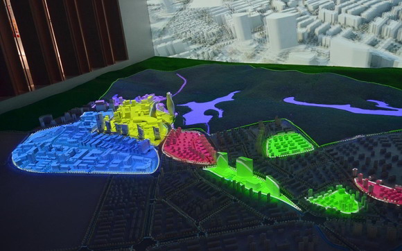 接下來,我們來到沉浸式數字沙盤方案,該展項由12臺VPL-F635HZ打造,將詳實內容與動態影像精彩匹配。其中,3臺VPL-F635HZ拼融投影寬幅大畫面,展現小鎮規劃各項數據與宏大目標,9臺VPL-F635HZ垂直吊裝并隱藏于頂棚之上,投影觀景臺下方的精美立體地圖沙盤,內容講述哪個區域時,沙盤相應位置即會閃耀光彩,用影像讓地圖變得生動逼真,呈現繁華交通、高樓大廈、綠色園區等,令人興奮。