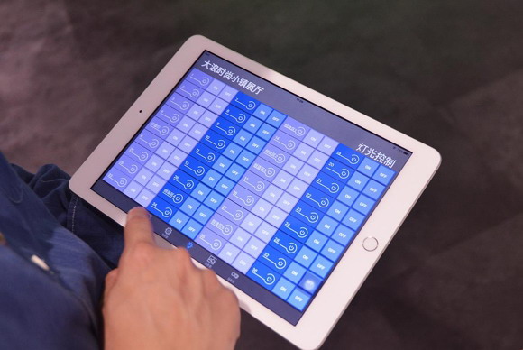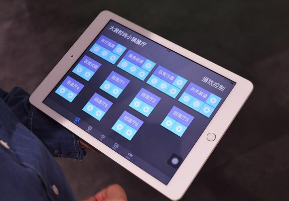 整個項目由深圳建業的合作伙伴深圳藝博堂設計施工一體化完成,不僅創造了豐富、精彩的大畫面投影方案,還打造了專業控制系統。我們看到,通過平板電腦上清晰直觀的操控界面,即可輕松控制展廳中的影像、燈光、音響、內容播放等硬軟件設備,讓客戶獲得更好使用體驗。
