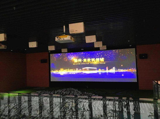 滁州高教科創城利用數字沙盤和融合投影主屏幕向觀眾直觀展示科創城布局及規劃。展示廳共采用了10臺CR5450HL激光投影機,其具有4500流明高亮度與1920*1080全高清分辨率。展示廳中央由2臺CR5450HL采用正投融合的方式,將科創城未來繁榮發展景象投射在巨幅屏幕上,與地面8臺激光投影機融合投射出的沙盤交相呼應,加以CR5450HL激光光源的非凡色彩表現力和融合拼接中色彩的一致性,把未來科創城鳥瞰圖生動地搬到了參觀者的面前,并伴隨著立體聲效解說營造出能讓人身臨其境的參觀體驗。