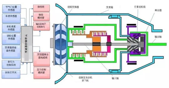 自動變速器汲取汽車發動機產生的功率,然后通過符合各種駕駛需求的不同的齒輪傳動比傳導這些功率。齒輪傳動比之所以不同,是為了確保發動機轉速(RPM)和供應給車輪的扭矩與當前車速和加速度匹配。來自發動機飛輪的動力通過扭矩變換器傳輸給變速器(見圖1)。