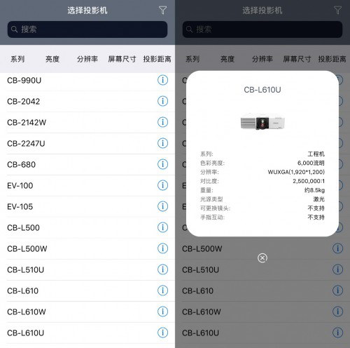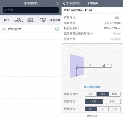 Tips:若系統(tǒng)推薦為可更換鏡頭的機(jī)型(大多為工程投影機(jī)),APP會(huì)顯示該機(jī)型可適配的鏡頭列表,讓用戶手動(dòng)選擇鏡頭型號(hào)。