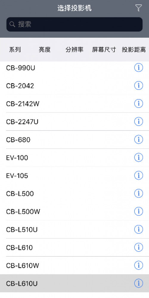 當(dāng)你打開愛普生投影距離計(jì)算器APP,便可以選擇自己使用的投影機(jī)型號(hào)。無(wú)論你使用的是高端的工程投影機(jī),還是具有觸摸功能的教學(xué)投影機(jī),都能可以在APP中找到對(duì)應(yīng)型號(hào)。
