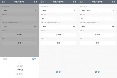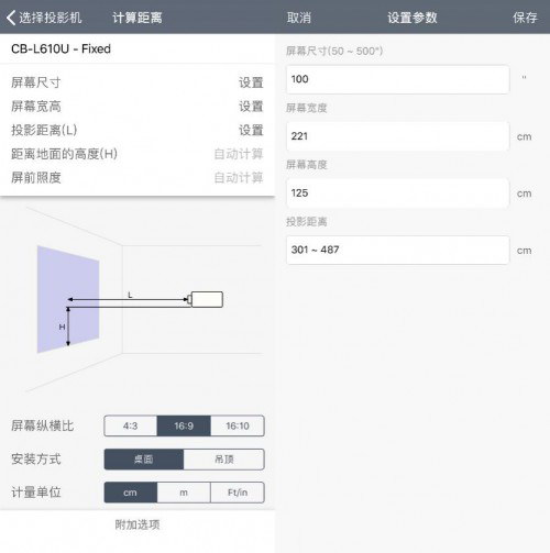 此外,如果是沒有確定投影機(jī)的用戶,可以點(diǎn)擊右上角漏斗圖標(biāo),在選擇畫面中根據(jù)需求輸入亮度、分辨率、屏幕尺寸等關(guān)鍵信息,APP會(huì)首先推薦機(jī)型,并根據(jù)預(yù)設(shè)計(jì)算出投影距離。