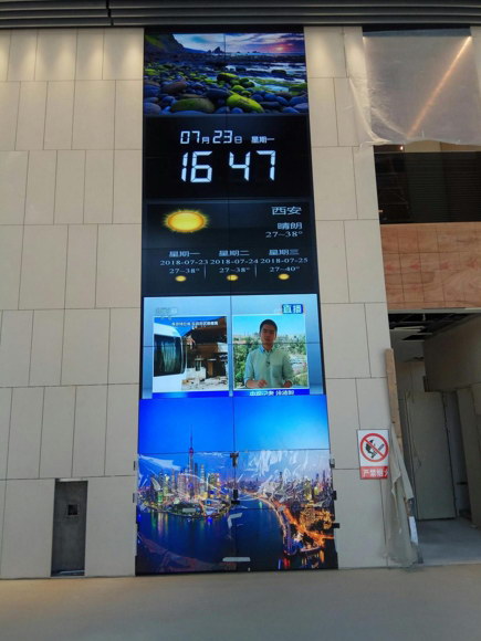 走進西安匯城國際展廳,最引人注目的是一塊超長的大屏幕顯示墻。該背景墻為55寸液晶拼接單元以2行11列拼接而成的顯示墻。該顯示墻采用德普視訊MCS云拼接圖像控制器來實現(xiàn),將多路網(wǎng)絡機頂盒信號采集,實現(xiàn)超高清畫質,其拼接規(guī)模和展現(xiàn)形式非常新穎。其拼接后達到近乎無縫的大畫面顯示,圖像顯示清晰、對比度高、色彩還原更加真實,畫面穩(wěn)定無閃爍,單屏周邊無眩光,在室內(nèi)明亮環(huán)境光條件下屏幕仍能顯示清晰明亮的圖像效果。