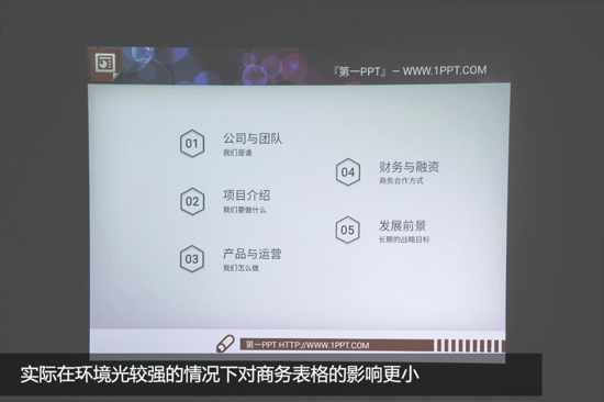 對一部分有會議升級需求的企業來說,分辨率高清的投影機也值得考慮。簡報中常出現的圖表視頻內容,將會隨分辨率提升實現畫質明顯提升,文字也會變得更銳利一些,適合空間較大或者開會人數較多的會議,高清投影機保證身處角落也能清楚觀看簡報內容。
