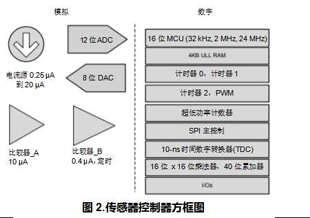 SimpleLink傳感器控制器是專用的16位中央處理單元(CPU)核心,在活動模式、待機模式和啟動耗能階段均只消耗極低功率。如圖 2 所示,該傳感器控制器包括模擬和數字外圍設備,它們專為實現超低功率而進行了優化。