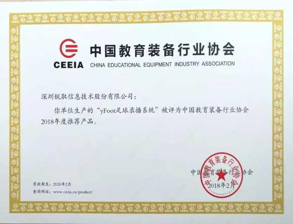2018年3月,中國(guó)教育裝備行業(yè)協(xié)會(huì)組織開(kāi)展了2018年度推薦產(chǎn)品工作,經(jīng)過(guò)教育裝備專家多輪嚴(yán)格評(píng)審,銳取yFoot校園足球錄播以無(wú)線便攜、操作簡(jiǎn)單、微信分享的品質(zhì)保障入選,獲政府優(yōu)先采購(gòu)權(quán)。