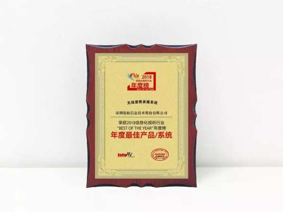 2018年12月,在2018信息化視聽(tīng)行業(yè)“BEST OF THE YEAR”年度榜評(píng)選中,經(jīng)品牌知名度、技術(shù)先進(jìn)性、科技創(chuàng)新能力、市場(chǎng)占有率、企業(yè)資格認(rèn)證、市場(chǎng)銷售和消費(fèi)者認(rèn)可、社會(huì)評(píng)價(jià)等方面綜合評(píng)定,銳取的“無(wú)線便攜錄播系統(tǒng)”榮獲年度最佳產(chǎn)品獎(jiǎng)!