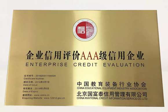 2018年10月,國(guó)家權(quán)威部門(mén)對(duì)銳取在企業(yè)信譽(yù)、產(chǎn)品品質(zhì)、用戶服務(wù)各方面表示了充分的肯定,予以2018年教育裝備行業(yè)企業(yè)信用等級(jí)評(píng)價(jià)復(fù)審?fù)ㄟ^(guò),再次正式被授予企業(yè)信用等級(jí)“AAA”級(jí)最高信用等級(jí)榮譽(yù)證書(shū)。