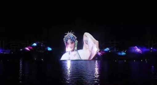 昆曲中的人物在夜色中對(duì)唱,透過水幕還隱約能看到后面的景觀,仿佛虛幻縹緲的海市蜃樓!