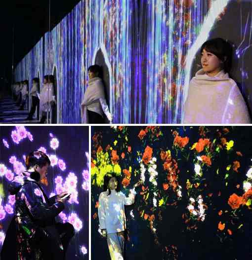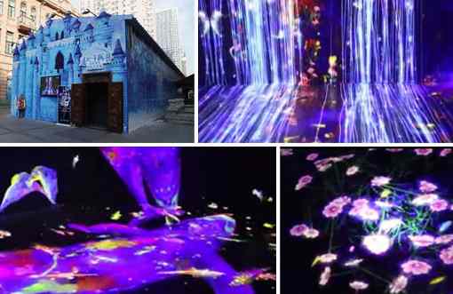 走進城堡,立刻進入了由奧圖碼激光投影機營造的沉浸式夢幻光影世界,占地320平方米,共設有花海、繁花瀑布、星河池畔、花蝶谷四大展區。有的展廳內色彩變幻,滿屋開出勃勃生機的向陽花,有的展廳星光熠熠,好似觸手可及……流光溢彩,構建出一幅幅流動的繽紛畫面,或鯨魚翻滾,或壁虎漫步。參觀者漫步其間,與圖案互動嬉戲,留連忘返。