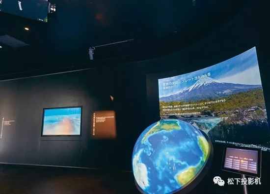 這個展項共采用23臺PT-FRW62C(中國型號)松下激光投影機。它們是呈現從海平面到海拔3776米的山景風光的主要視頻設備。投影機由兩個或兩個以上的屏幕組成,投射出自然逼真的富士美景,最大限度地向參觀者傳達了富士山的魅力。展示山頂景觀的是由8臺PT-FRW62C(中國型號)投影機投射出的寬屏斜幕,向參觀者展示了富士山白晝之間及日出時的美景變化,令人印象深刻。