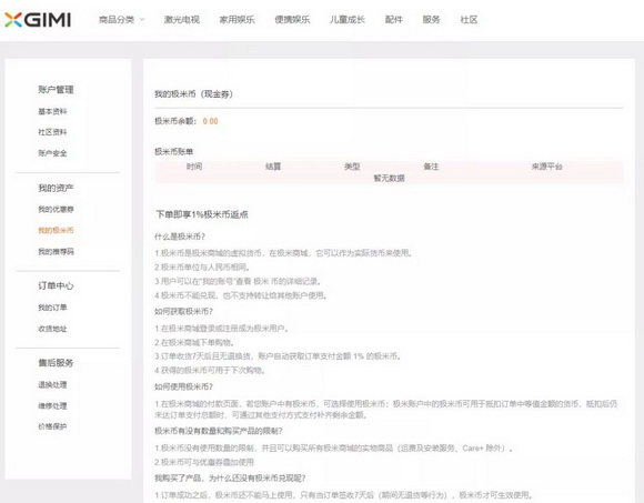 3.極友們可以登錄官方商城在“個人中心”查看 極米幣的詳細記錄,或點擊極米科技服務號微信菜單欄——購買極米——在線商城——個人中心——我的極米幣 中查詢。