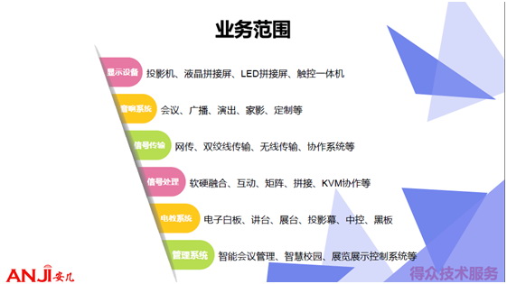 廣州得眾信息科技有限公司是一家專業于投影系統、音視頻系統及智能化控制管理系統服務的企業,擁有自家的技術團隊、軟件團隊、服務團隊和投影音視頻分銷團隊,與合作伙伴形成更緊密、更高效、更完善的合作機制,提升企業的核心競爭力。