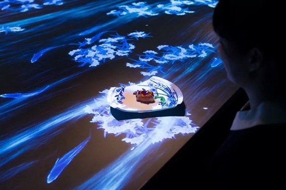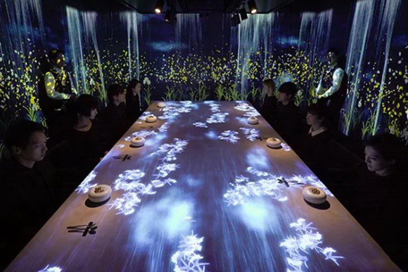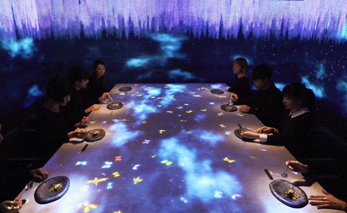 藝術團體teamlab在東京銀座區創建的網紅餐廳,正是采用了這樣的沉浸式體驗方案,現場美輪美奐,隨食物與環境不斷變換季節與場景。