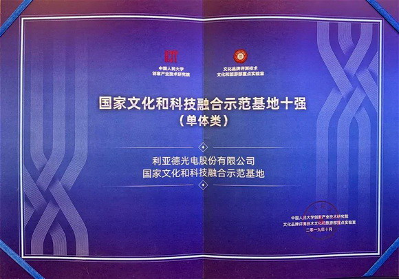 2019年10月25日,中國人民大學創意產業技術研究院、文化品牌評測技術文化和旅游部重點實驗室在2019中國(南京)文化和科技融合成果展覽交易會上發布了“國家文化和科技融合示范基地十強榜單”。此次,利亞德光電股份有限公司成功入圍單體類基地十強并排名榜首,成為業界典范。